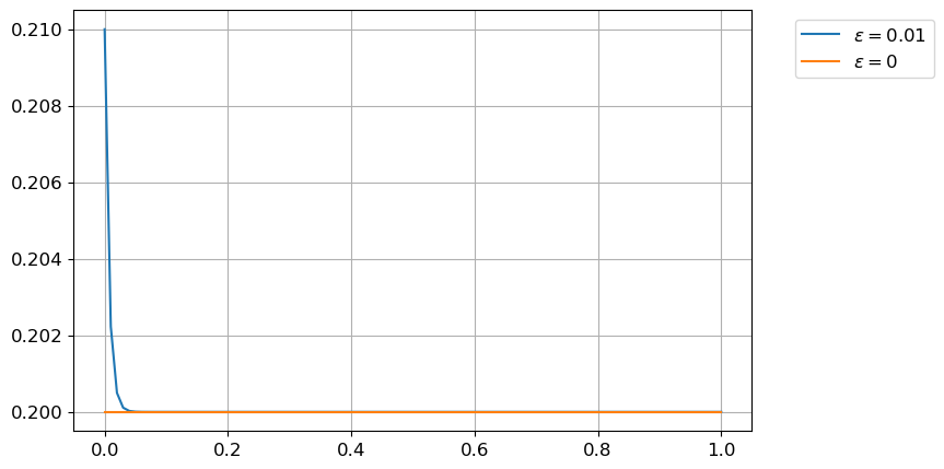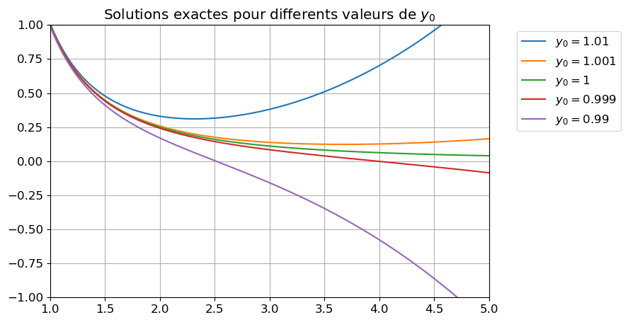 Si \(\varepsilon\to0\), alors \(y_{\varepsilon}(t)\to \frac{1}{5}\) : le problème est numériquement bien posé, car l’erreur sur la solution sera inférieure à l’erreur sur la condition initiale.