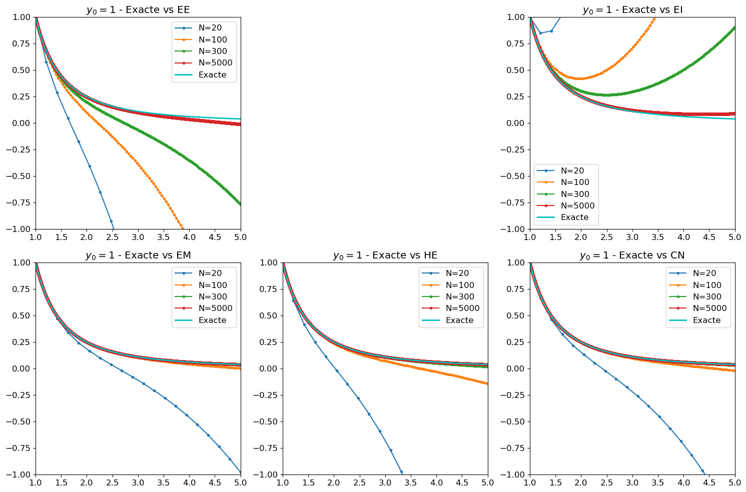 Pour que \(u_n\simeq y_n\) il faut que \(\frac{1}{(1+hb)^n}\simeq e^{-bt_n} \in]0,1]\), donc il faut que \(0\le\frac{1}{1+hb}<1\) c’est-à-dire pour n’importe quelle valeur de \(h\). Dans cet exemple, pour obtenir la convergence il n’est pas nécessaire de limiter le pas \(h\). Cependant, pour une edo quelconque, à chaque pas de temps on doit résoudre une équation non-linéaire.