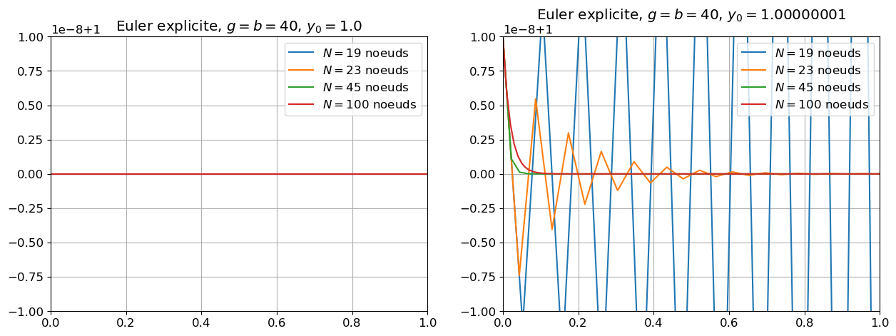 Pour que \(u_n\simeq y_n\) il faut que \((1-150h)^n\simeq e^{-150(nh)} \in]0,1]\), donc il faut que \(|1-150h|<1\), c’est-à-dire \(h<\frac{1}{75}\).