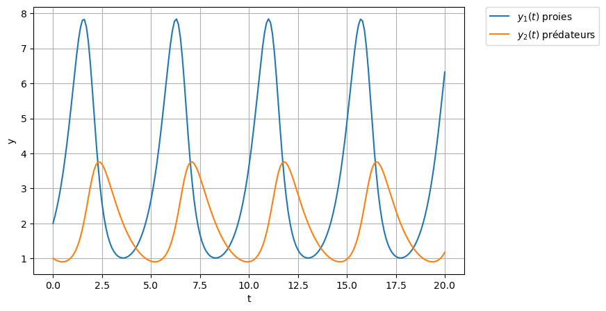 avec \(\mathbf{y}(t)=(y_1(t),y_2(t),\dots,y_n(t))\) le vecteur des fonctions recherchées dépendant de la variable \(t\) et \(\boldsymbol{\varphi}=(\varphi_1,\varphi_2,\dots,\varphi_n)\) une fonction de \(\mathbb{R}\times\mathbb{R}^n\to\mathbb{R}^n\), on donne comme argument la fonction \(\boldsymbol{\varphi}\) (qui doit avoir deux paramètres, même dans le cas autonome), la condition initiale \(\mathbf{y}_0\) et les points de l’interval de temps où approcher la solution (qui commence à \(t_0\)). Elle retourne un tableau Numpy (même si \(t\) était une liste).