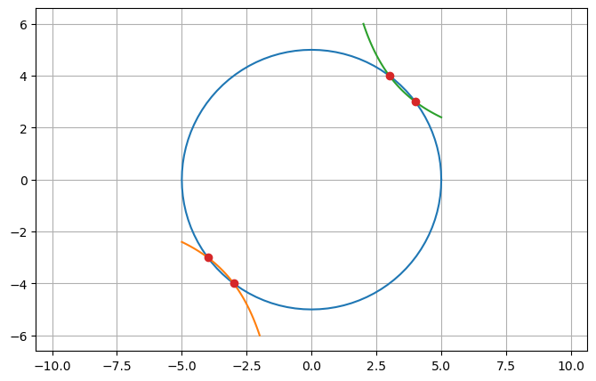 pphi = lambda t,y : [ (y[0])**2+(y[1])**2-25 , y[0]*y[1]-12 ]