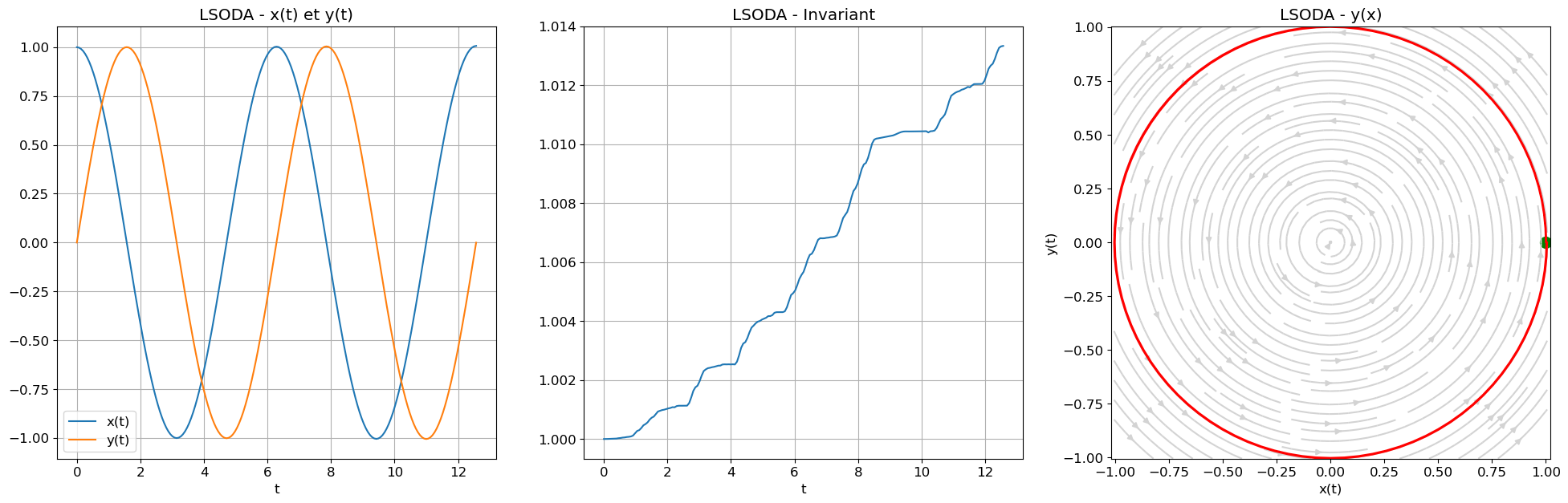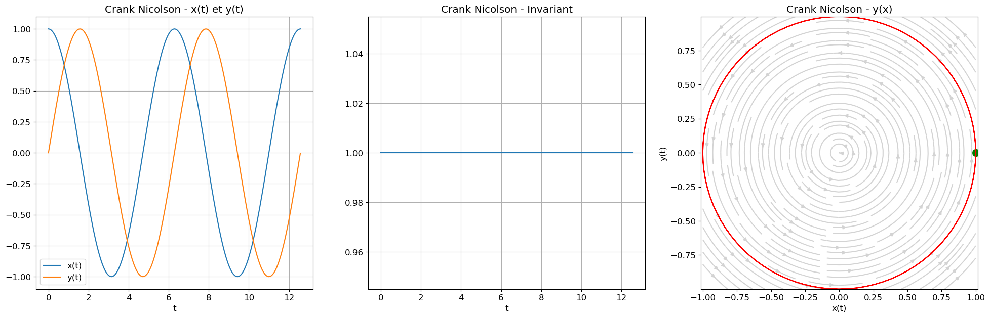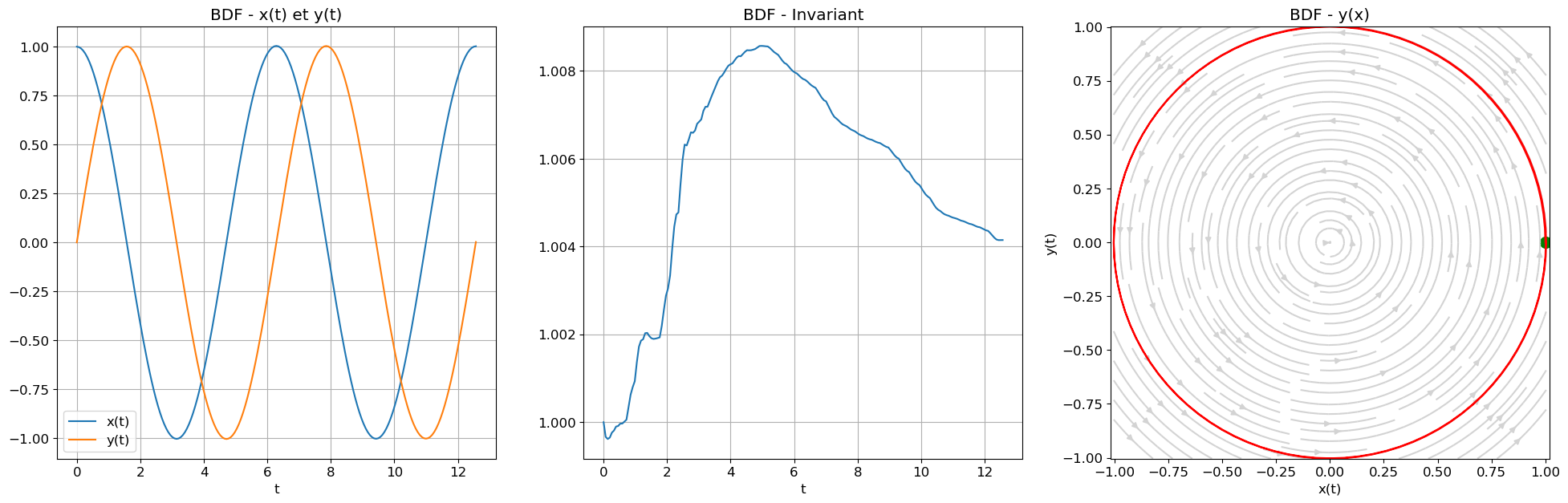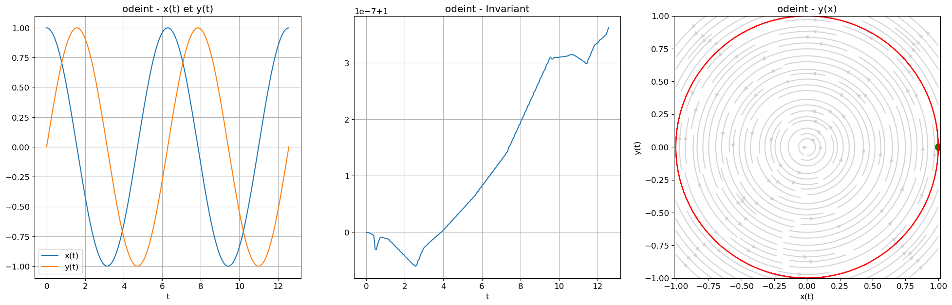 Exercice 4 [1h15] : Implémentation des schémas classiques appliqués à un système de deux EDO d’ordre 1. Bien que la solution exacte soit disponible pour ce problème, l’accent sera mis sur la conservation d’un invariant, souvent lié à un principe de conservation physique tel que l’énergie totale du système.