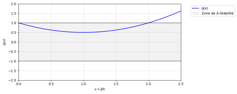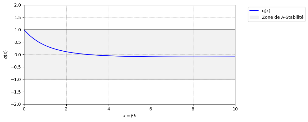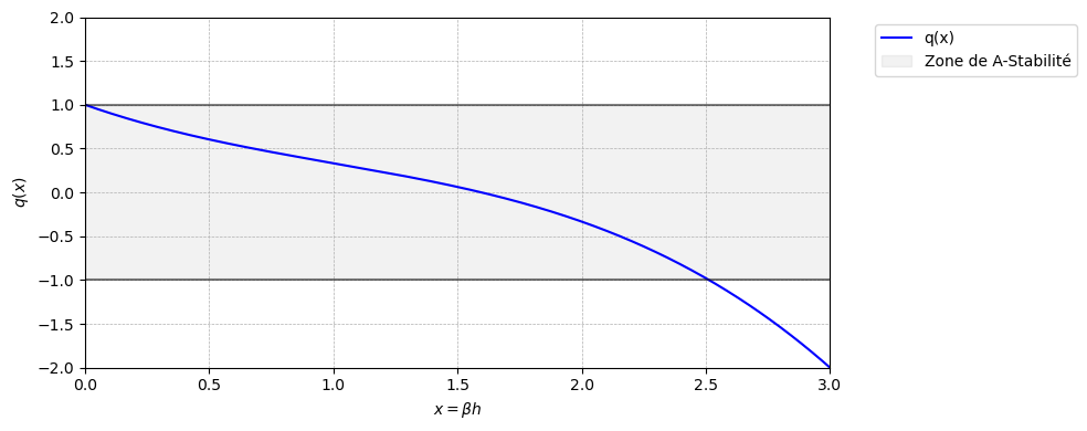 Étant une méthode à un pas, on peut réécrire \(u_{n+1}\) en fonction de \(u_n\) : \( u_{n+1} = q(h\beta)u_n. \) Le schéma est A-stable ssi \(|q(h\beta)|<1\).