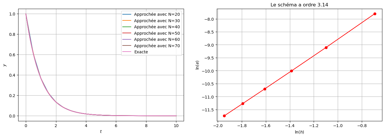 Exercice : étudier l’ordre théorique de convergence (au plus jusqu’à 4) et vérifier empiriquement si l’ordre annoncé coïncide avec l’ordre observé sur un problème de Cauchy dont on connaît la solution exacte.