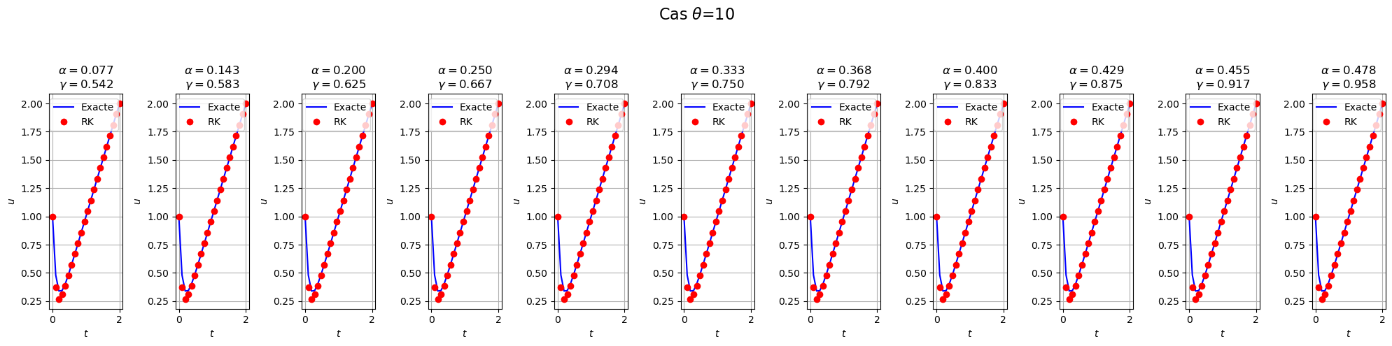 Le schéma qu’on va construire permet de calculer implicitement \(u_{n+1}\) à partir de \(u_n\) par la formule de récurrence \(\begin{cases} u_0 = y_0 \\ K_1 = \varphi\left(t_n+h,u_n+hK_1\right)\\ K_2 = \varphi\left(t_n+\alpha h,u_n+\alpha hK_1\right)\\ u_{n+1} = u_n + h \left((1-\gamma)K_1+\gamma K_2\right) & n=0,1,\dots N-1 \end{cases}\)