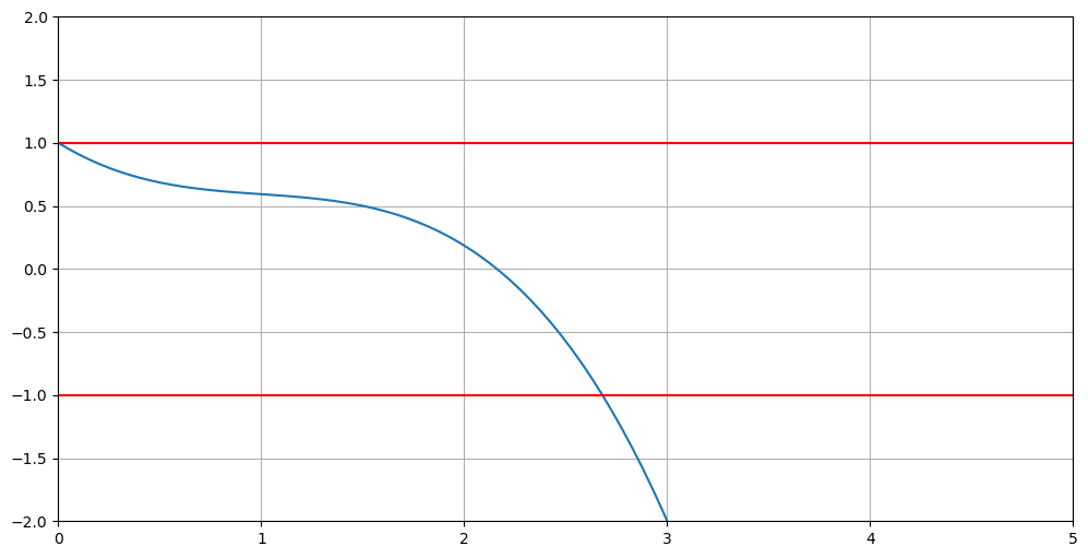 # p3 = sp.plot(-1,(x,0,5),ylim=(-2,2),show=False,line_color='r')
