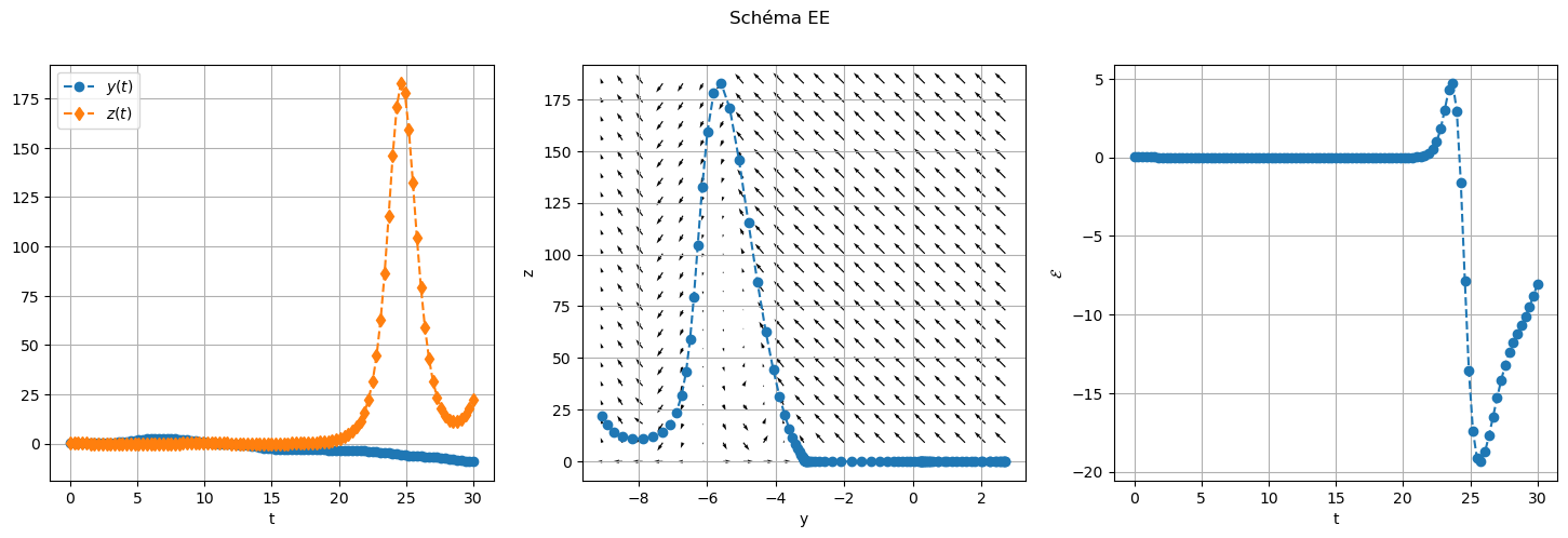 On s’intèresse au problème de Cauchy \( \begin{cases} y'(t)=\sin(y(t))-2z(t)e^{y(t)},\\ z'(t)=z(t)\Big(z(t)e^{y(t)}-\cos(y(t))\Big),\\ y(0)=\frac{1}{2},\\ z(0)=\frac{1}{4}, \end{cases} \qquad t\in[0,30] \)