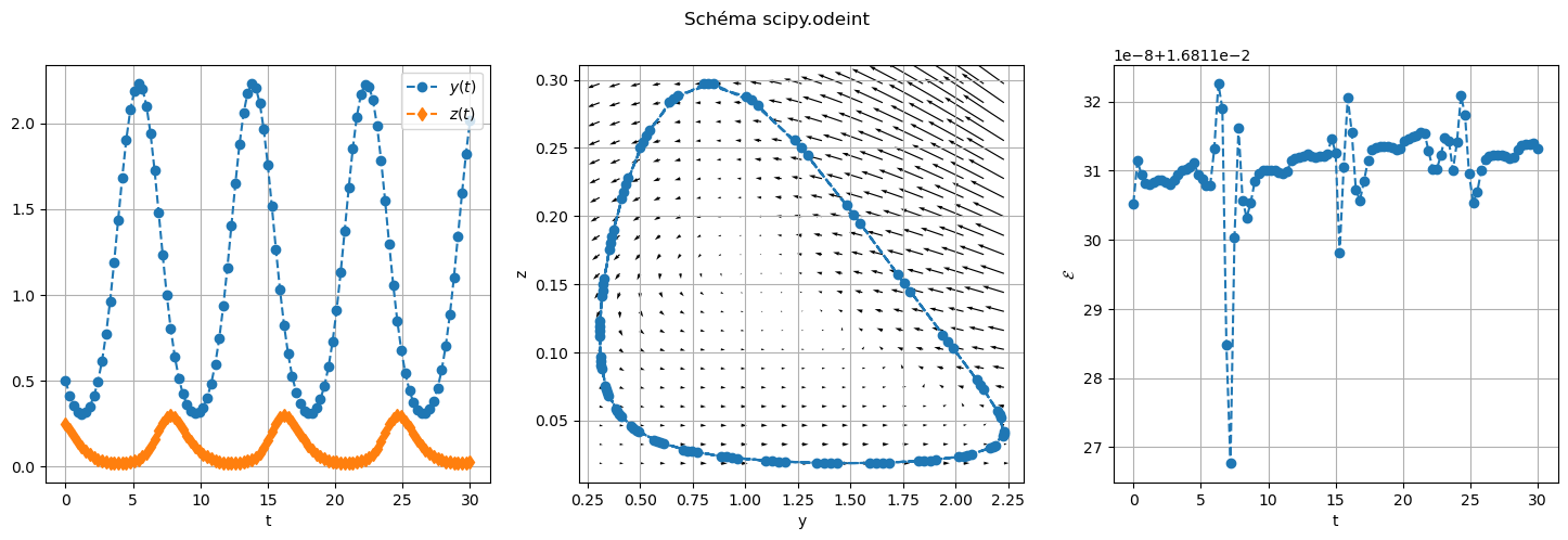 affichage(tt,uu,ww,HH_num,"scipy.odeint")