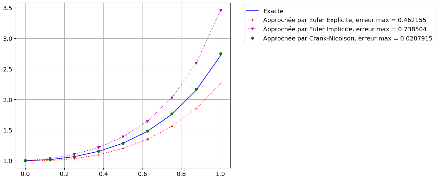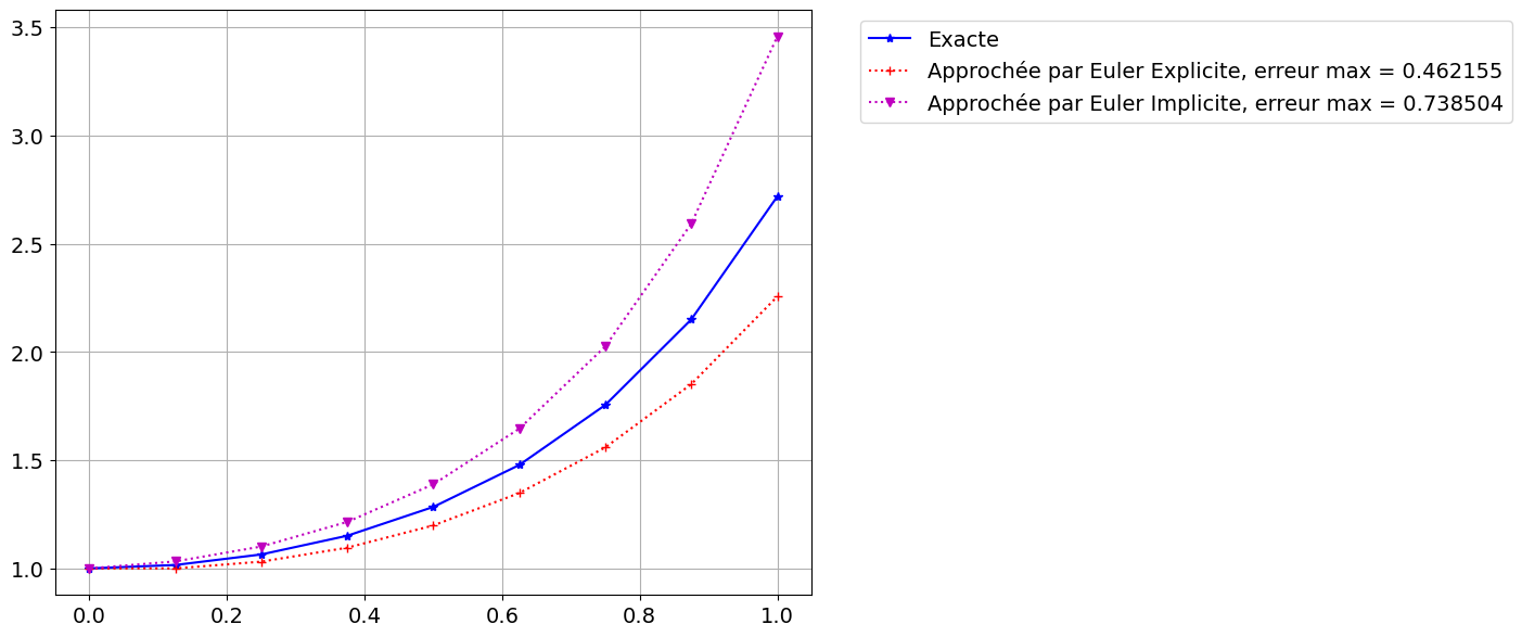 On compare les graphes des solutions exacte (en bleu) et approchées (en rouge) et on affiche le maximum de l’erreur: