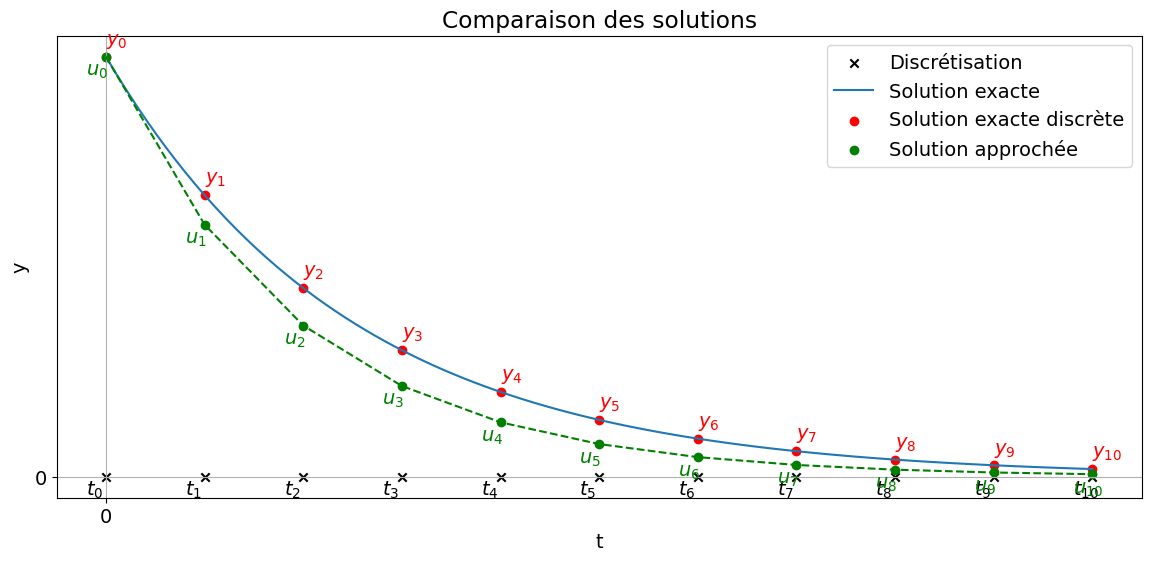 - L’ensemble de \(N+1\) valeurs \(\{u_0 = y_0, u_1,\dots , u_{N} \}\) représente la solution numérique.