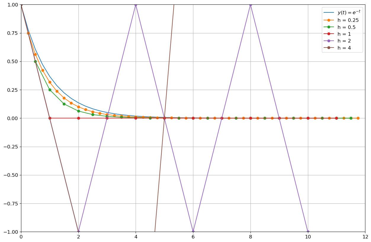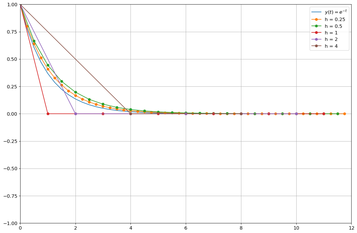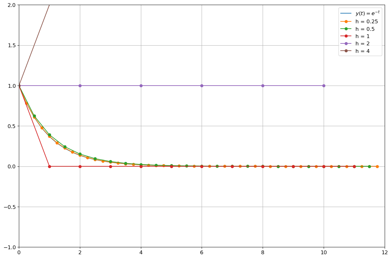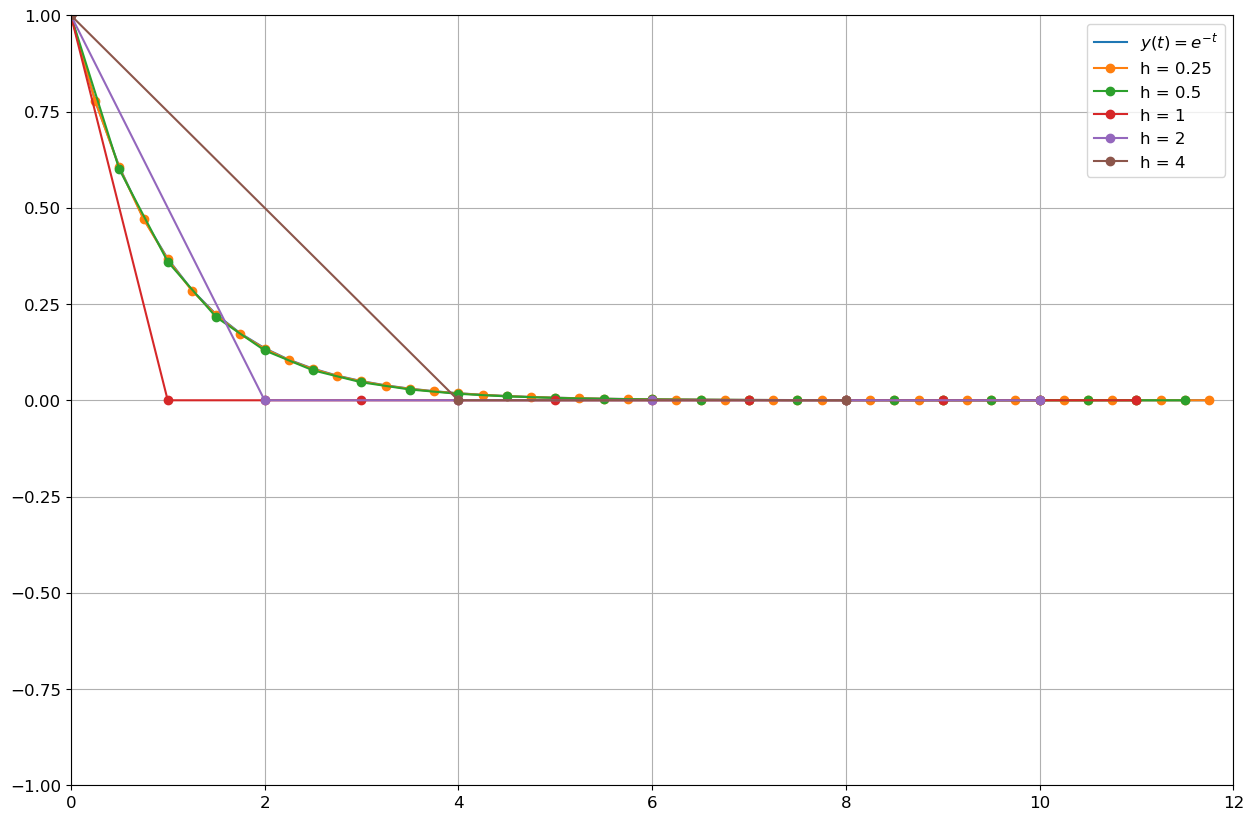 \( \begin{cases} y'(t)=-y(t), & t\in[0;12]\\ y(0)=1. \end{cases}\)