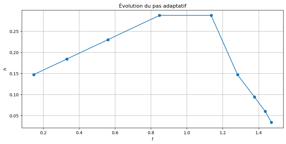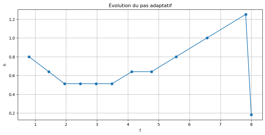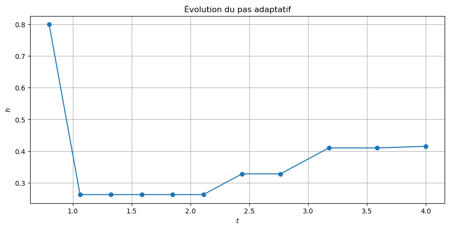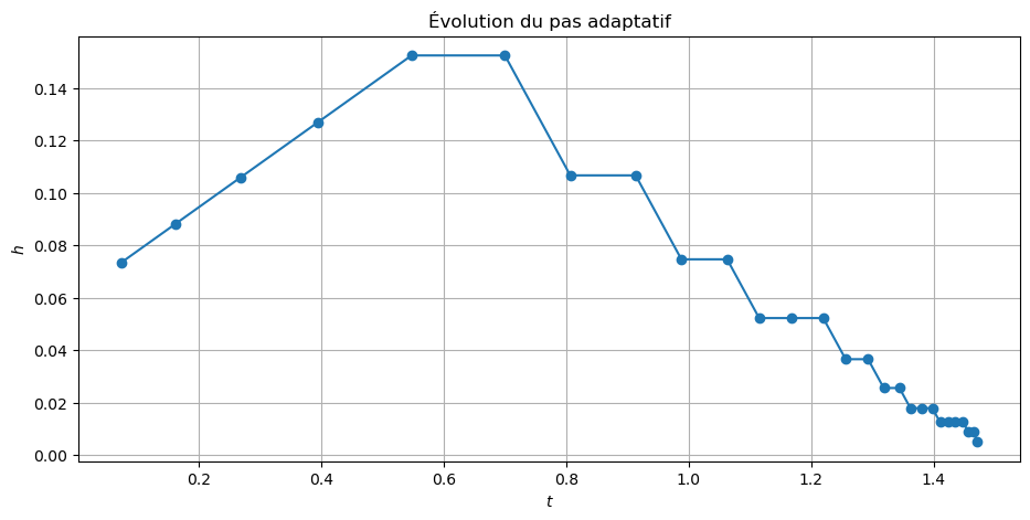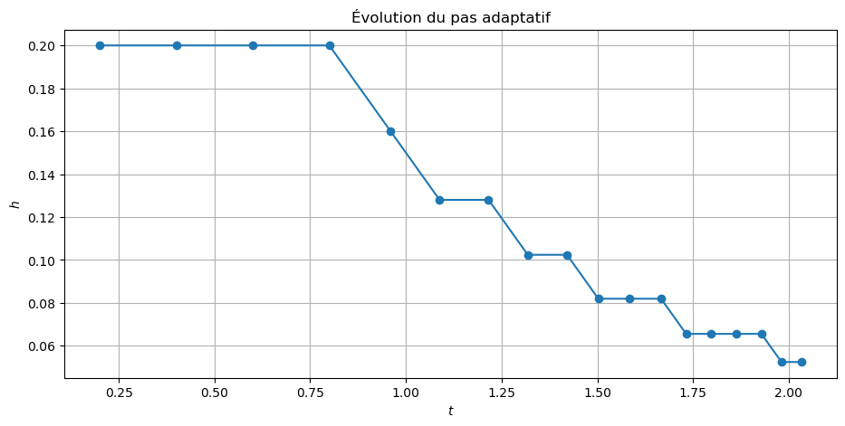 - Utiliser Euler-Heun adaptatif avec \(h_0 = 1\) et une tolérance \(\text{tol} = 5\times 10^{-3}\).