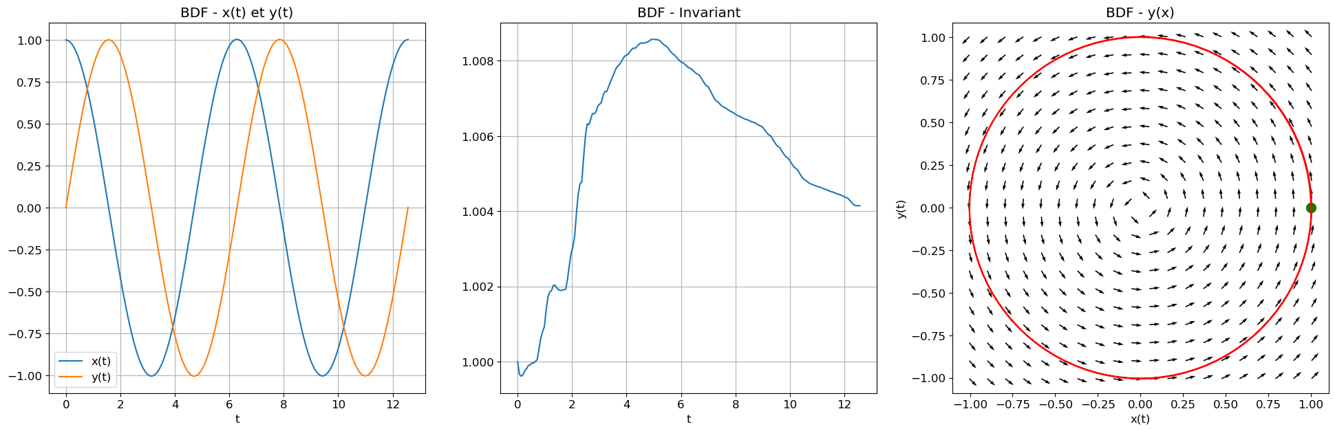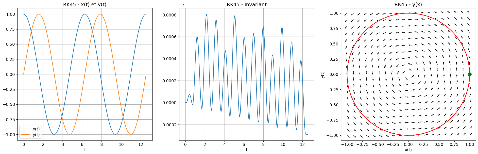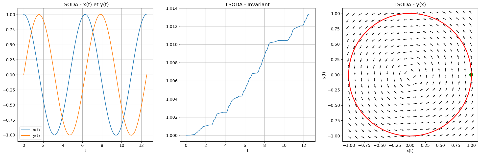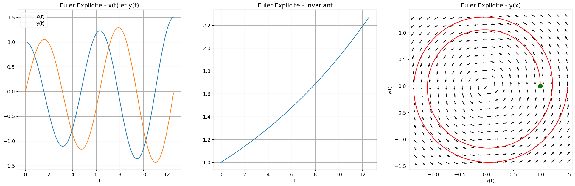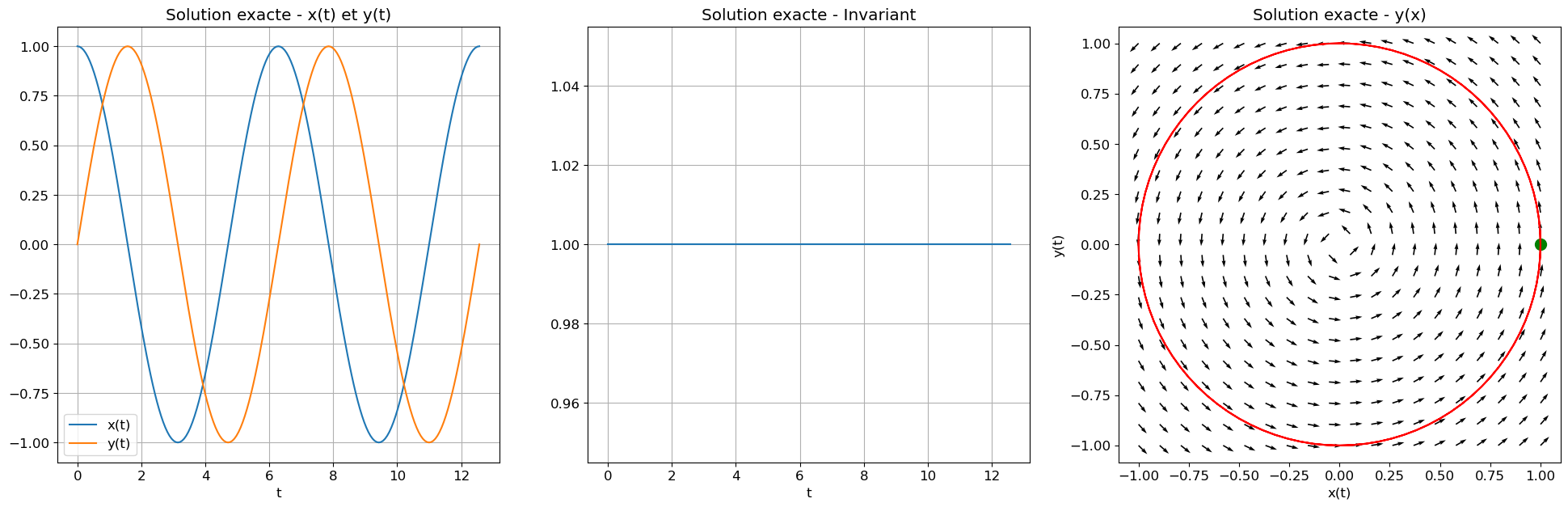 Exercice 4 : Implémentation des schémas classiques appliqués à un système de deux EDO d’ordre 1. Bien que la solution exacte soit disponible pour ce problème, l’accent sera mis sur la conservation d’un invariant, souvent lié à un principe de conservation physique tel que l’énergie totale du système.
