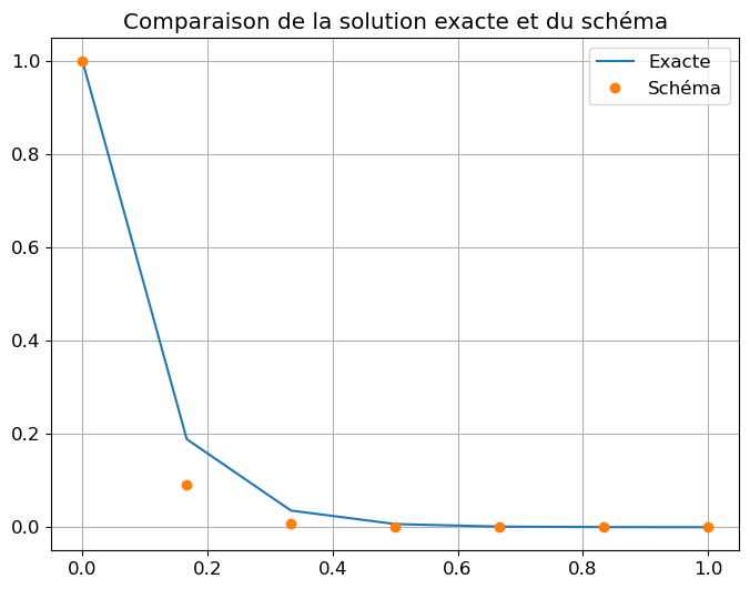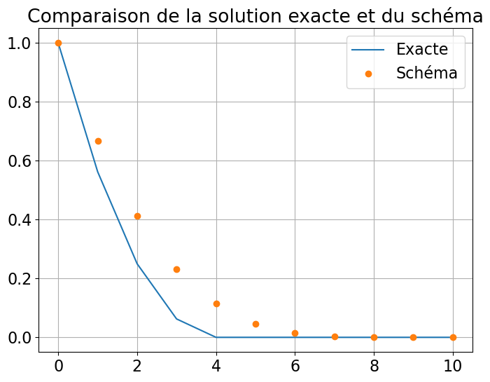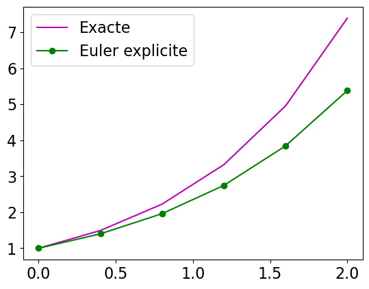 - Calculer analytiquement la solution obtenue avec la méthode d’Euler explicite sur l’intervalle \([0;2]\) avec \(N_h=5\), ensuite la tracer avec Python et la comparer à la solution exacte.