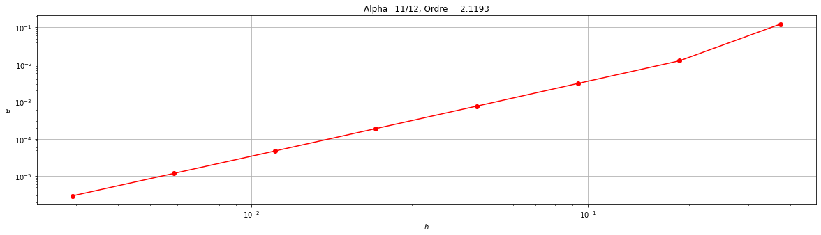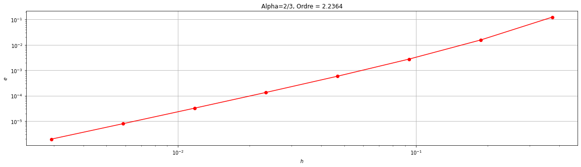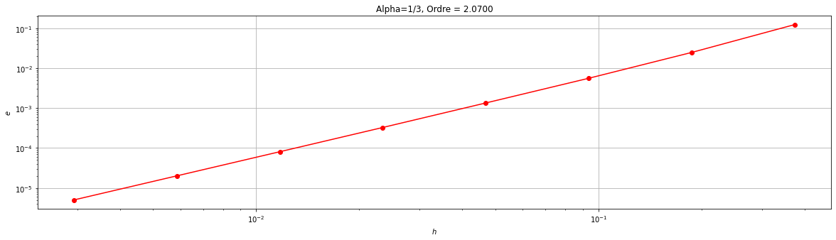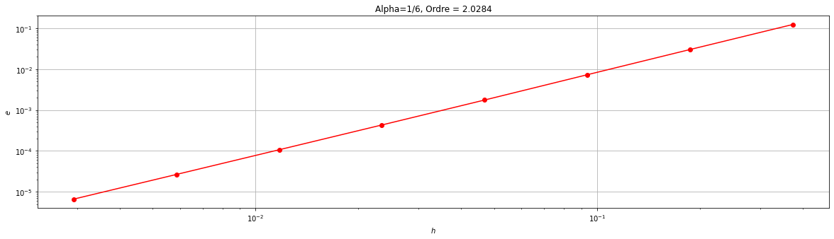 title('Alpha={}, Ordre = {:1.4f}'.format(alpha,polyfit(log(H),log(err), 1)[0]))