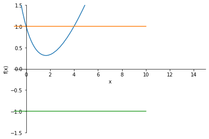 sym.plot(q,1,-1,xlim=[-1,15],ylim=[-1.5,1.5]);