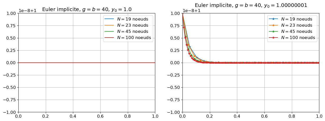 plt.title(f"Euler implicite, $g=b={g}$, $y_0={y0}$")
