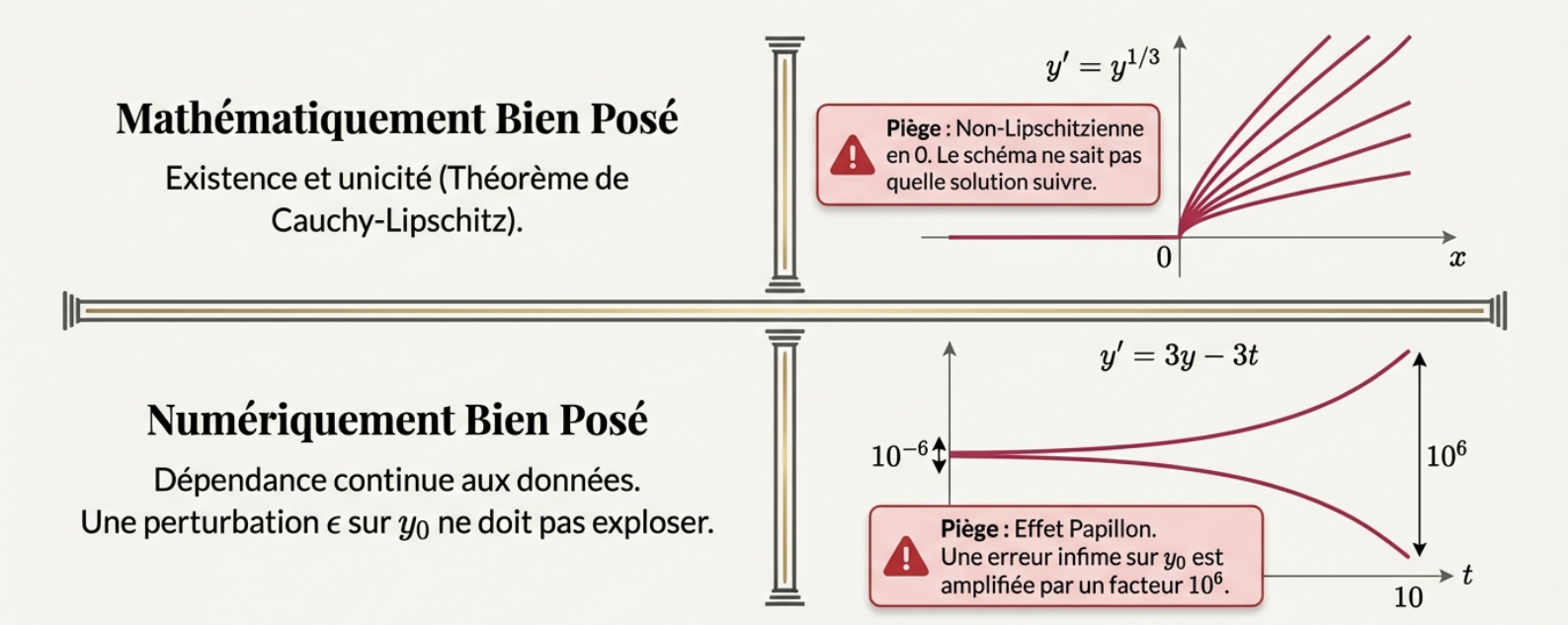 En général, il ne suffit pas qu’un schéma numérique soit convergent pour qu’il donne de bons résultats sur n’importe quelle équation différentielle. Dès qu’on tente d’approcher une solution, de nombreux facteurs peuvent en fait nous en éloigner : une étude mathématique sophistiquée doit alors être envisagée. En particulier, il faut que le problème de Cauchy soit