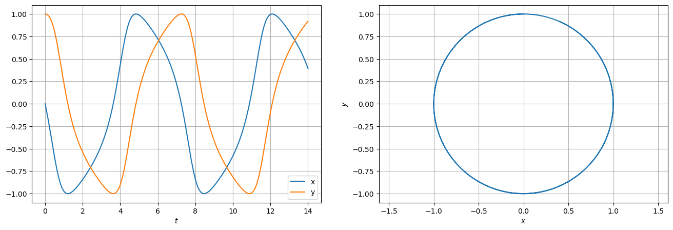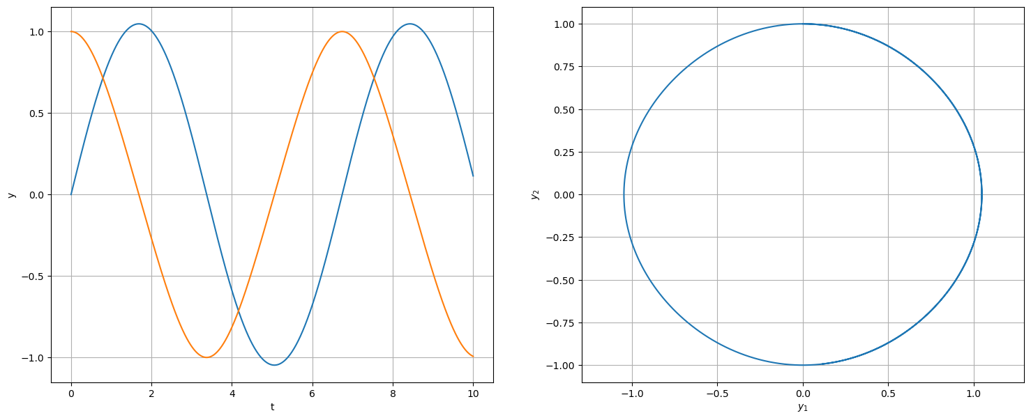 avec \(\mathbf{y}(t)=(y_1(t),y_2(t),\dots,y_n(t))\) le vecteur des fonctions recherchées dépendant de la variable \(t\) et \(\boldsymbol{\varphi}=(\varphi_1,\varphi_2,\dots,\varphi_n)\) une fonction de \(\mathbb{R}\times\mathbb{R}^n\to\mathbb{R}^n\), on donne comme argument la fonction \(\boldsymbol{\varphi}\) (qui doit avoir deux paramètres, même dans le cas autonome), la condition initiale \(\mathbf{y}_0\) et les points de l’interval de temps où approcher la solution (qui commence à \(t_0\)). Elle retourne un tableau Numpy (même si \(t\) était une liste).