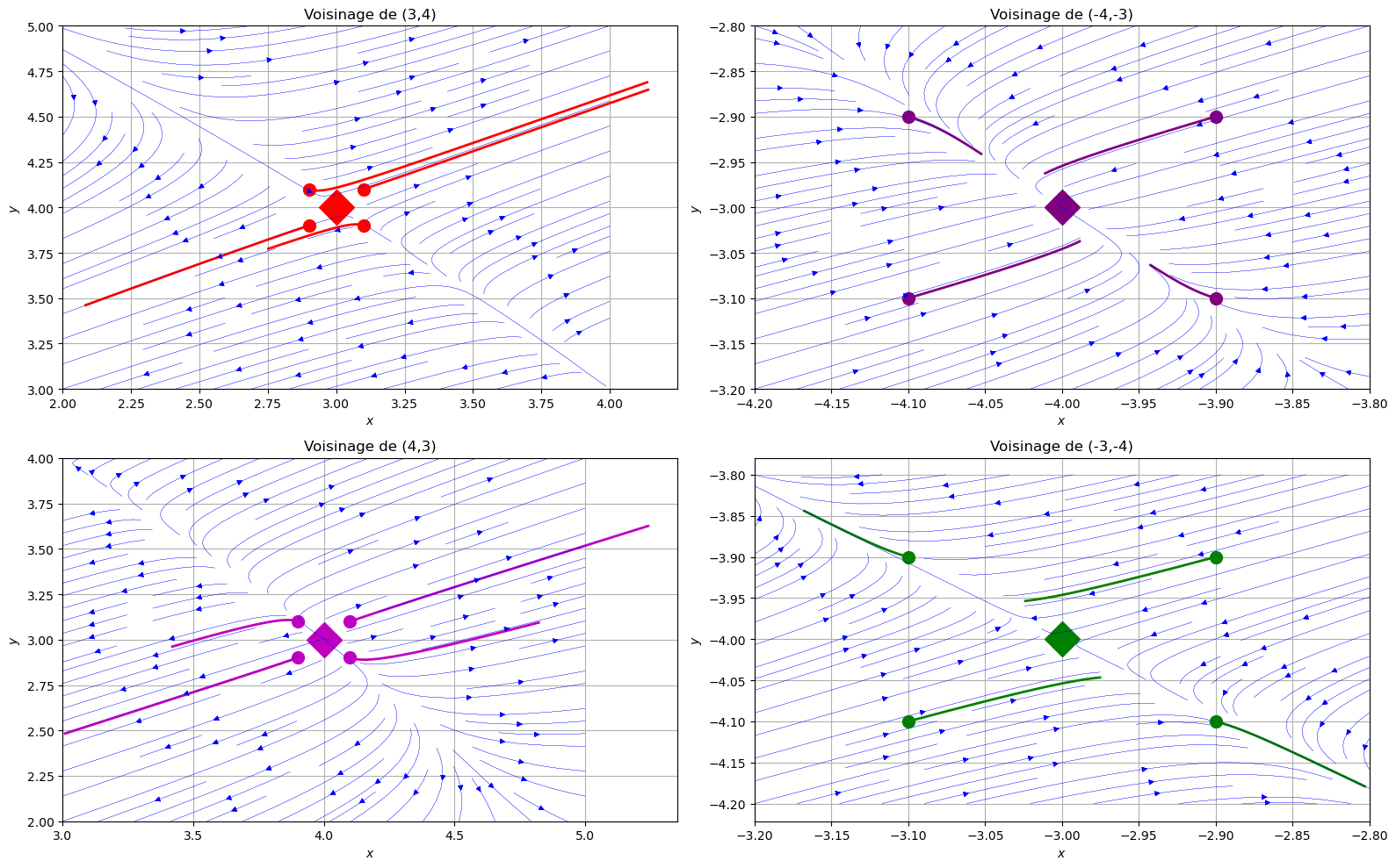 for y0,tfin in [ ((3+0.1,4+0.1),0.2), ((3-0.1,4+0.1),0.5) , ((3+0.1,4-0.1),0.4), ((3-0.1,4-0.1),0.2)]: