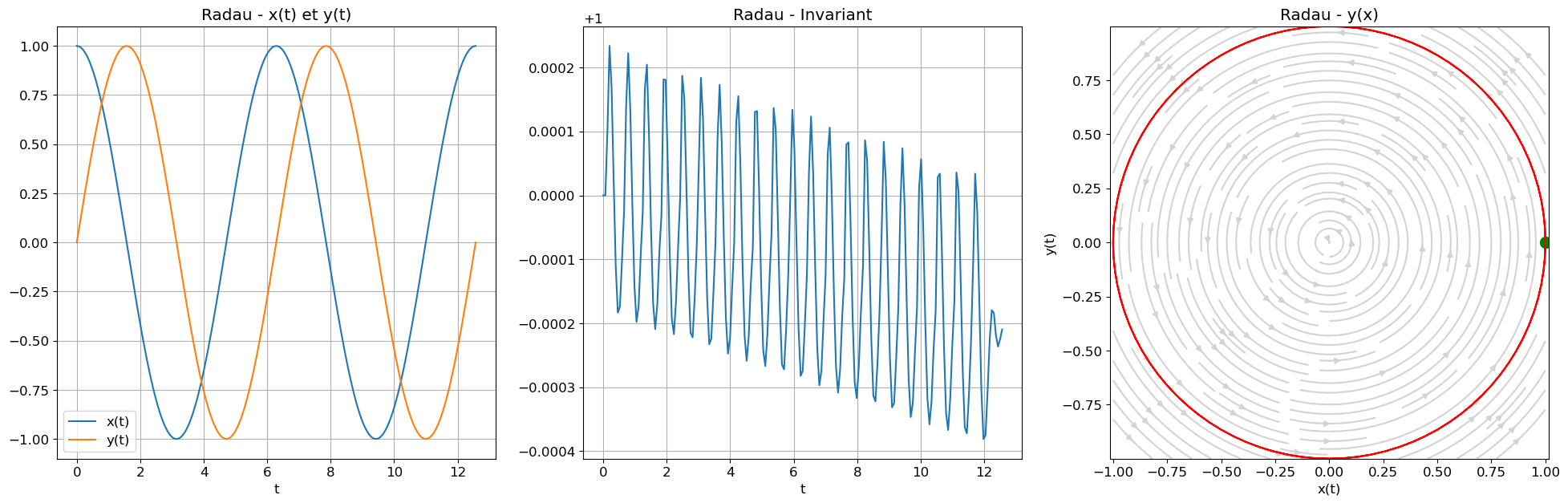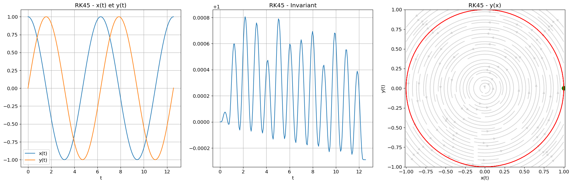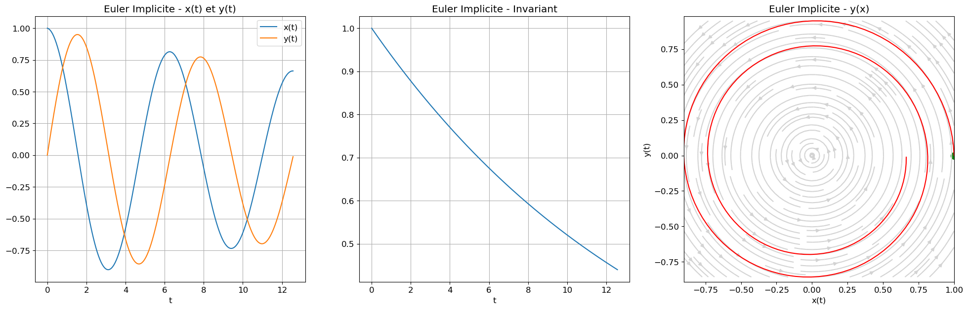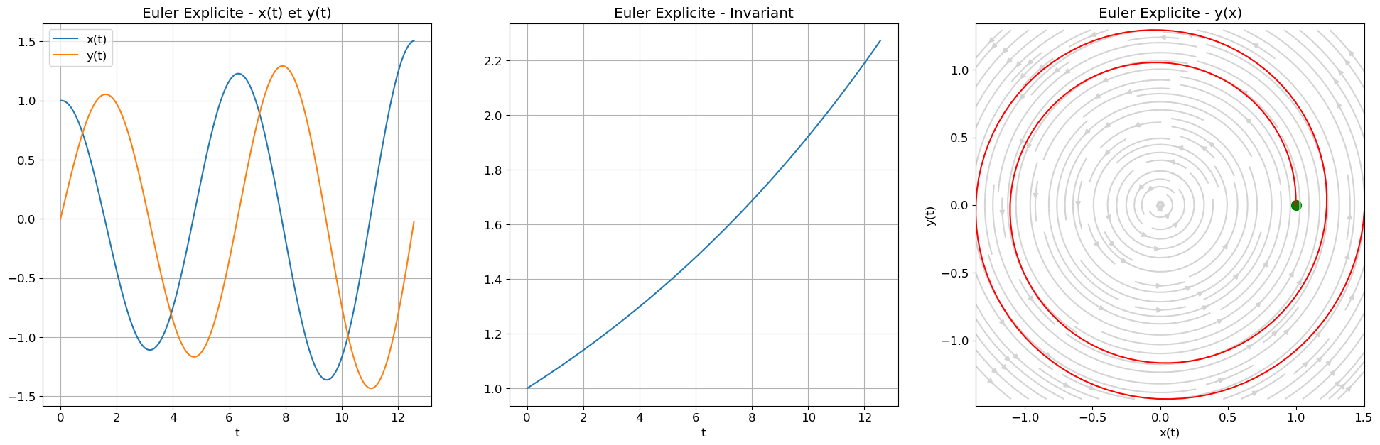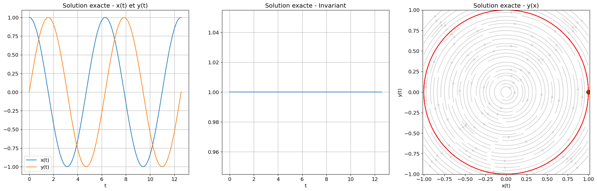 Exercice 4 [1h15] : Implémentation des schémas classiques appliqués à un système de deux EDO d’ordre 1. Bien que la solution exacte soit disponible pour ce problème, l’accent sera mis sur la conservation d’un invariant, souvent lié à un principe de conservation physique tel que l’énergie totale du système.