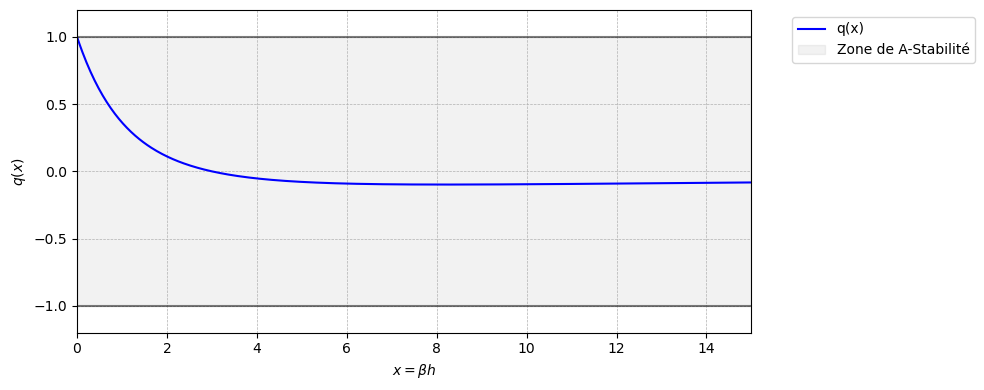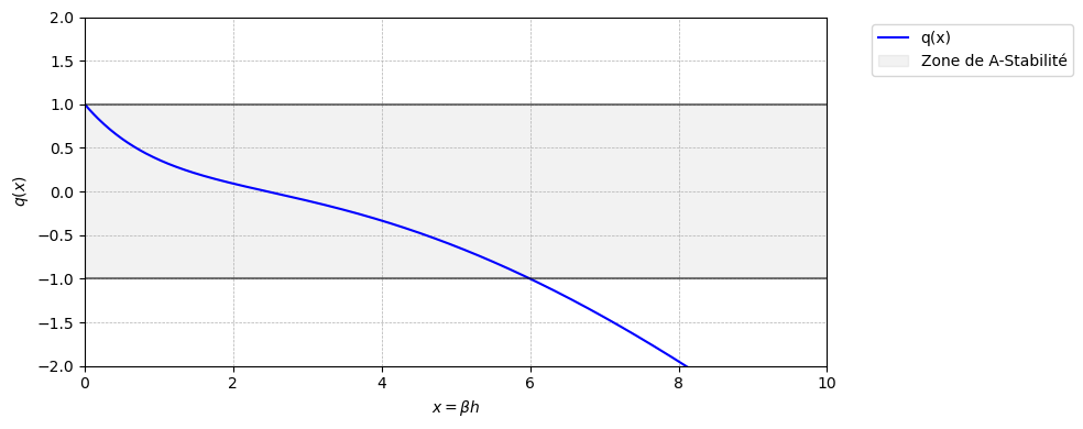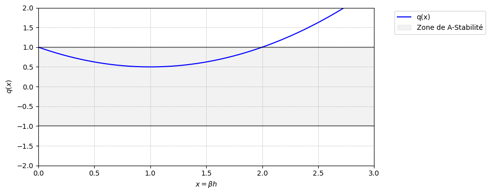 Étant une méthode à un pas, on peut réécrire \(u_{n+1}\) en fonction de \(u_n\) : \( u_{n+1} = q(h\beta)u_n. \) Le schéma est A-stable ssi \(|q(h\beta)|<1\).