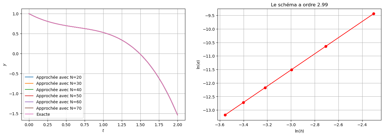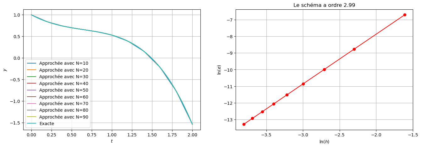 Exercice : étudier l’ordre théorique de convergence (au plus jusqu’à 4) et vérifier empiriquement si l’ordre annoncé coïncide avec l’ordre observé sur un problème de Cauchy dont on connaît la solution exacte.