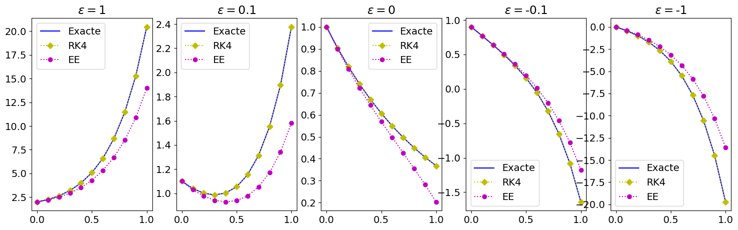 - Soit \(\varepsilon=0.2\). Utiliser la méthode d’Euler explicite puis les méthodes d’Euler implicite, de Crank-Nicolson et la méthode RK4 pour calculer la solution approchée avec un pas \(h=0.1\) et comparer les deux résultats en \(t=1\). Même exercice avec \(h=0.05\) et \(h=0.01\).