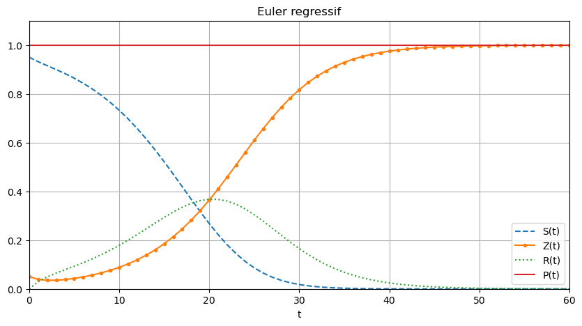 Euler implicite \( \begin{cases} S_{n+1}=S_n+h\varphi_0(S_{n+1},Z_{n+1},R_{n+1},t_{n+1}),\\ Z_{n+1}=Z_n+h\varphi_2(S_{n+1},Z_{n+1},R_{n+1},t_{n+1}),\\ R_{n+1}=R_n+h\varphi_3(S_{n+1},Z_{n+1},R_{n+1},t_{n+1}). \end{cases} \)