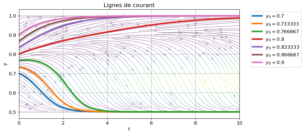 Pour s’en convaincre nous pouvons aussi demander à odeint du module scipy de tracer la solution approchée pour différentes valeurs de \(y_0\).