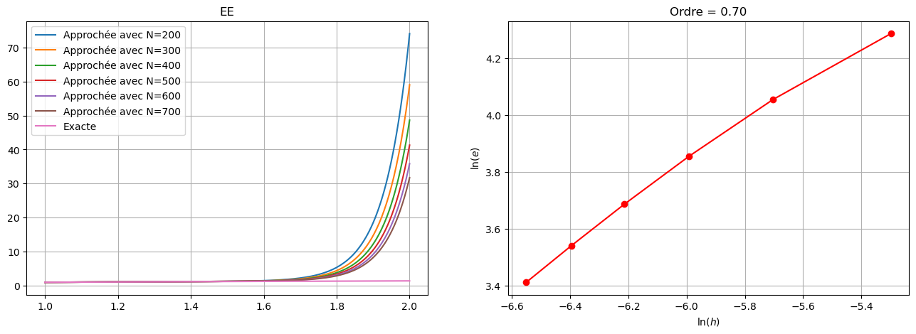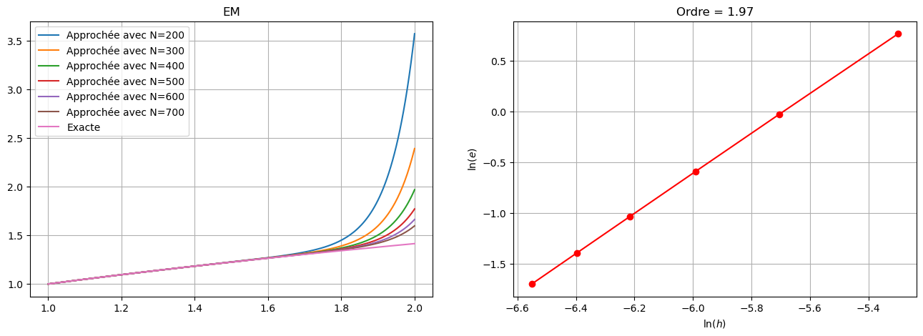 On calcule la solution exacte. On remarque que c’est un problème de Cauchy numériquement mal posé: si \(\varepsilon=0\) la fonction croît comme \(\sqrt{t}\), si \(\varepsilon>0\) comme une exponentielle. On doit donc choisir le schéma le plus précis parmi les schémas proposés, à savoir le schéma de Heun ou le schéma d’Euler Modifié ou de Crank-Nicolson qui sont d’ordre 2.