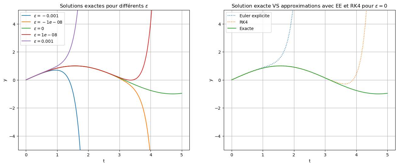 Pour bien comprendre, allons voir l’influence de l’ordre du schéma en comparant les approximations obtenues avec le schéma d’Euler explicite et un schéma RK aussi explicite d’ordre 4 dans le cas \(\varepsilon=0\) et \(\beta=-5\). On remarque qu’initialement les approximations sont proches de la solution exacte, mais l’erreur d’approximation du schéma d’Euler explicite fait que la solution approchée correspond plutôt à une solution ayant \(\varepsilon>0\). Le schéma RK est plus précis mais finit par diverger lui aussi.