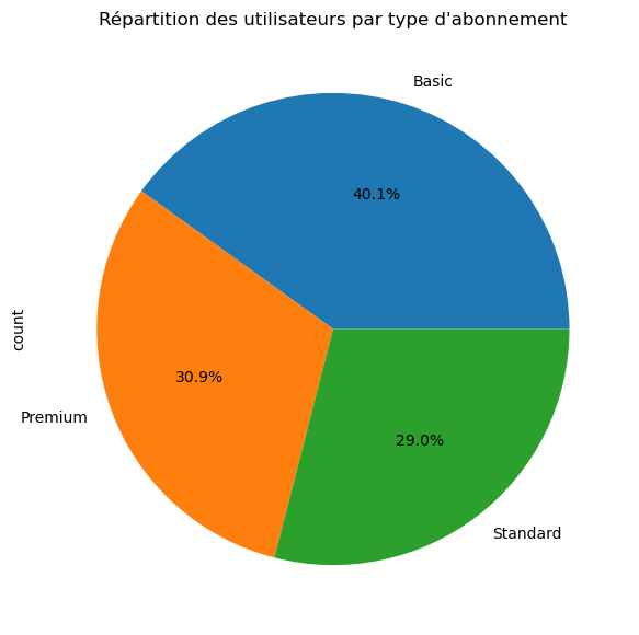 plt.title("Répartition des utilisateurs par type d'abonnement")