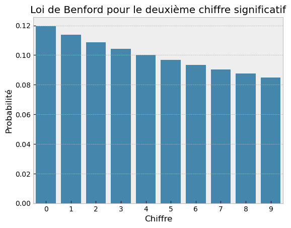 plt.title("Loi de Benford pour le deuxième chiffre significatif")