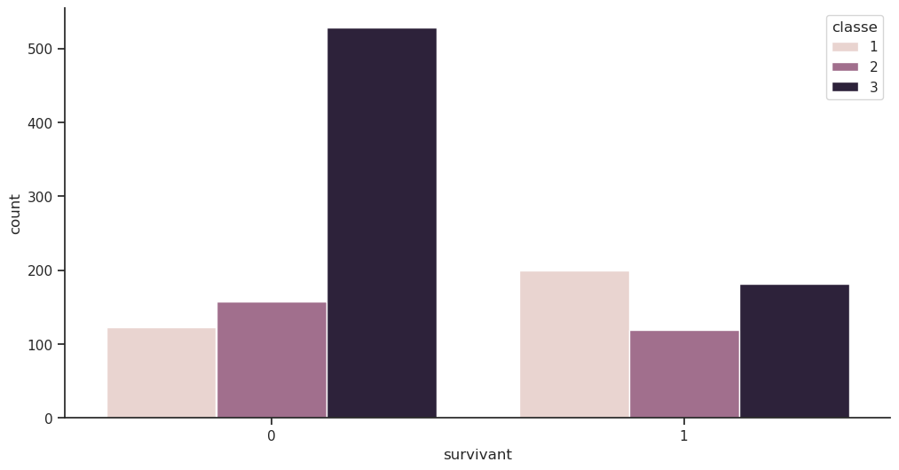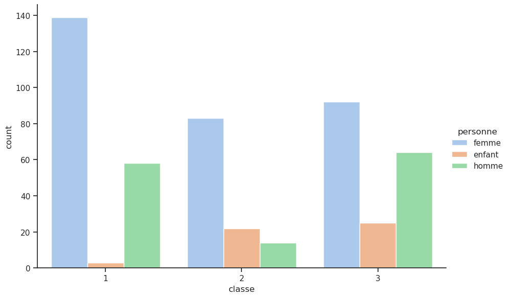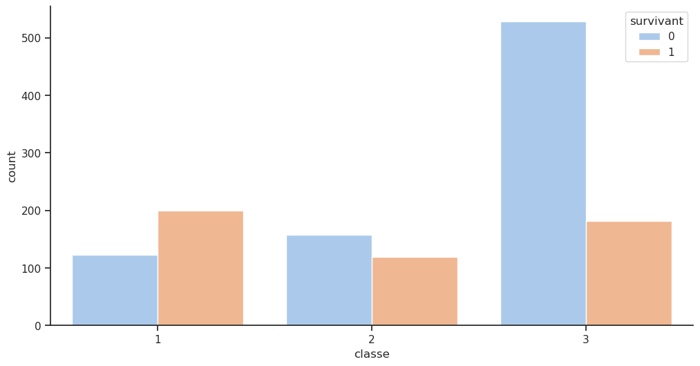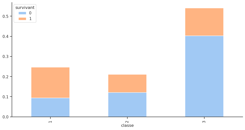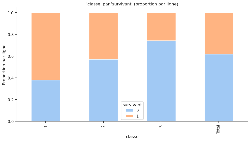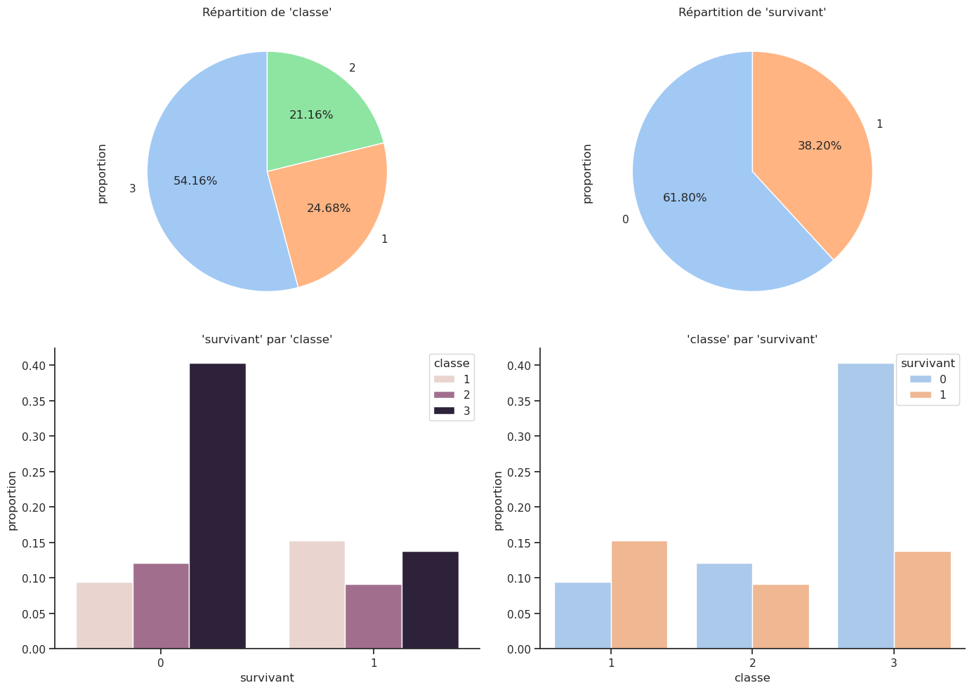 On note que la classe sociale a un impact sur la survie. Les femmes de première classe ont survécu à 96 %, contre 50 % pour celle de troisième classe. En ce qui concerne les hommes, 36 % des hommes de première classe ont survécu, contre 13 % pour ceux de troisième classe.