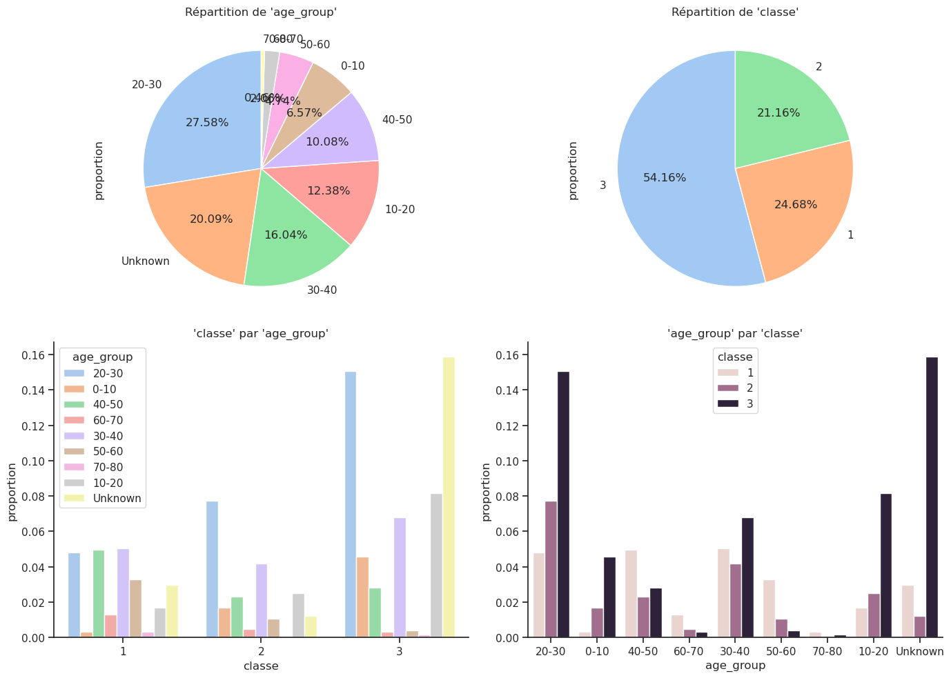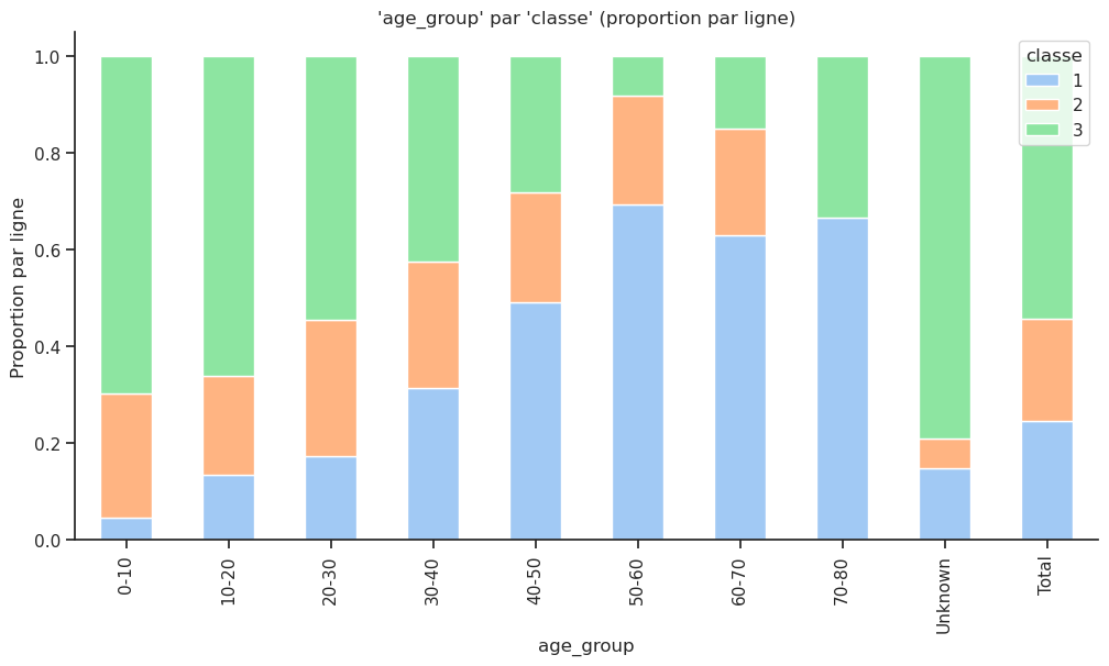 # Comme la colonne 'survivant' vaut 0 si décédé et 1 si survivant, la somme donne le nombre de survivants| age_group | 0-10 | 10-20 | 20-30 | 30-40 | 40-50 | 50-60 | 60-70 | 70-80 | Unknown |
