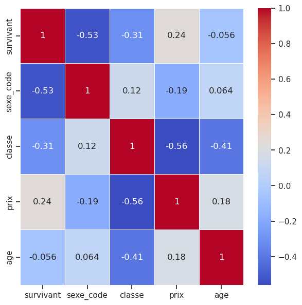 # sns.heatmap(sorted_corr_matrix, linewidths=0.5, annot=True, cbar=True, cmap="coolwarm");# dftemp = df[['survivant','sexe_code','age','classe']]