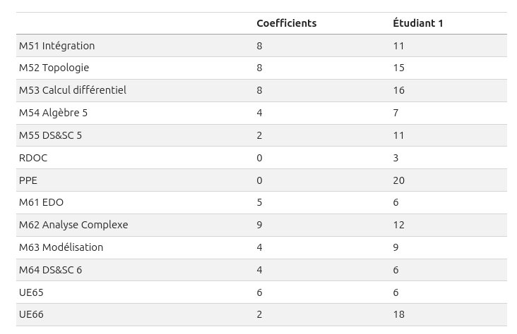 On s’intéresse aux résultats d’un étudiant (ou de deux étudiants) en L3 Mathématiques, pour les deux semestres de l’année universitaire.