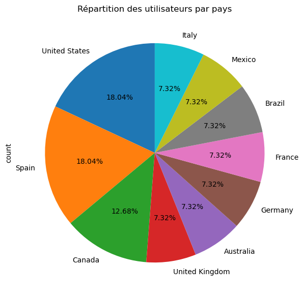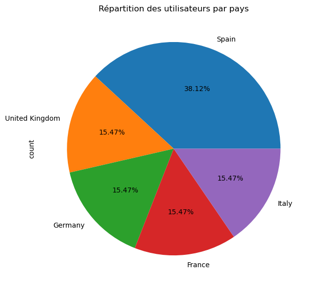 plt.title('Répartition des utilisateurs par pays')