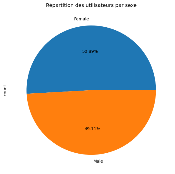 plt.title('Répartition des utilisateurs par sexe')